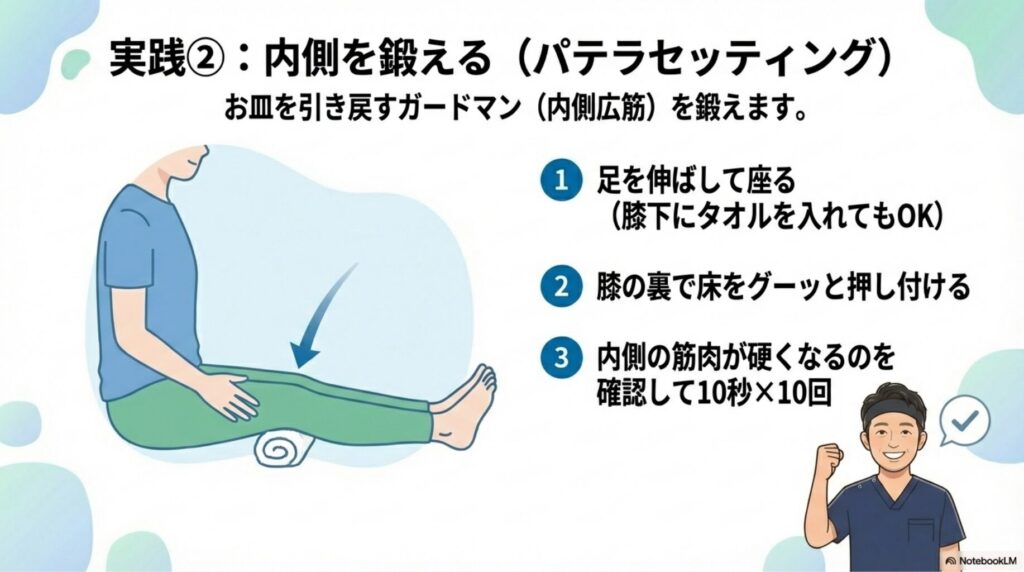 お皿を内側に引き戻すガードマン(内側広筋)を鍛えます。