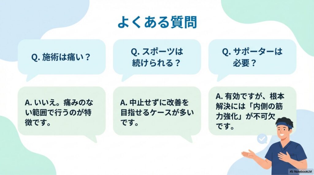A. 膝のお皿周りにパッドが入っているタイプのサポーターは、お皿のズレを物理的に防いでくれるため有効です。ただし、根本解決には「内側の筋力強化」が不可欠ですので、サポーターに頼り切りにならず、セルフケアと併用することをおすすめします。