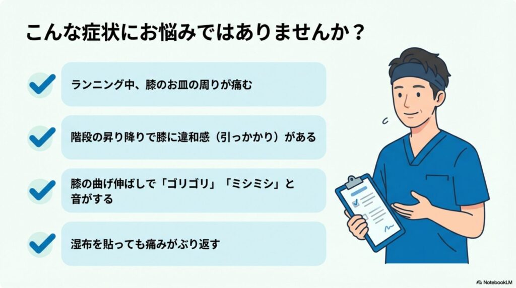 | 症状 | スムーズで無音 | 「ゴリゴリ」音、お皿の裏や周りの痛み |