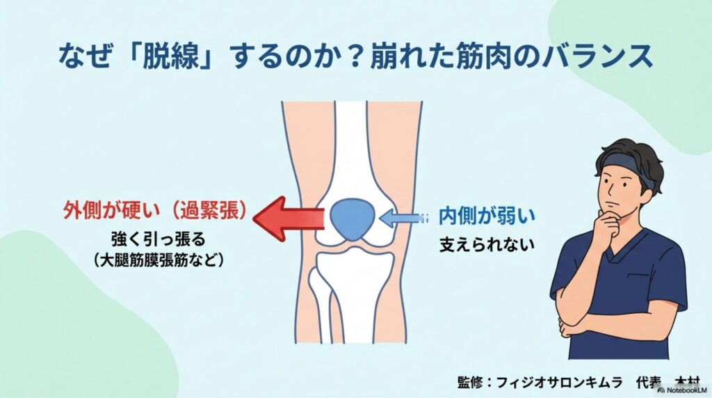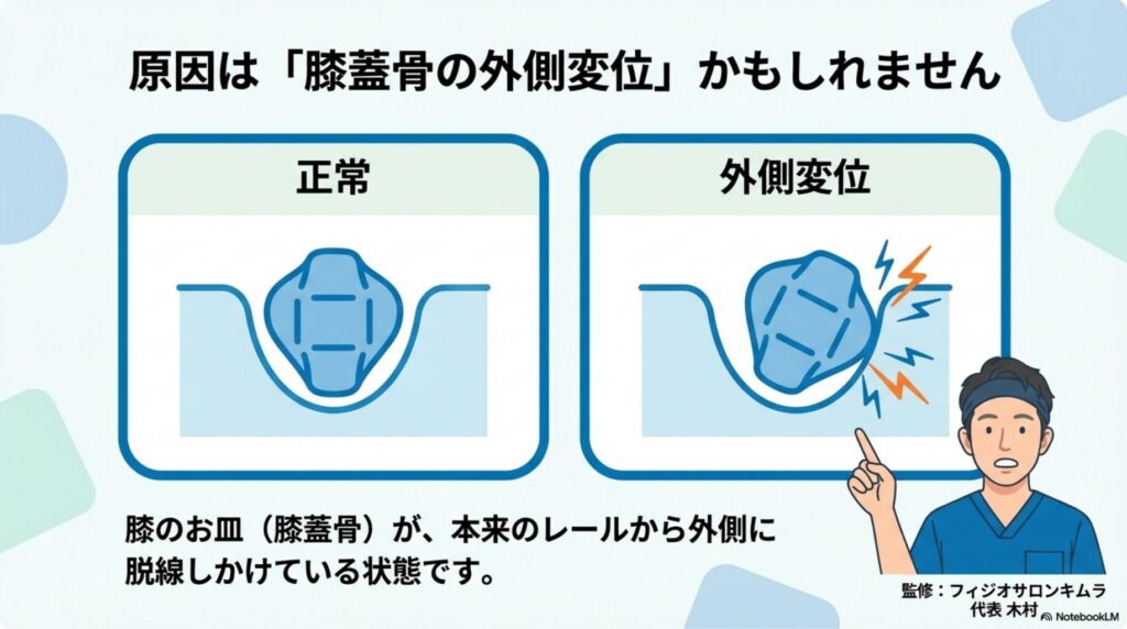 結論から言うと、膝の「ゴリゴリ音」や「抜けない痛み」の多くは、膝のお皿(膝蓋骨)が本来のレールから外側に脱線しかけている「膝蓋骨外側変位」が原因です。