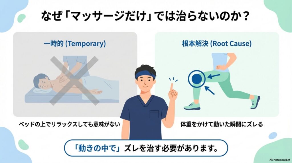 - 脳の書き換え:「動いても痛くない」という情報を脳に送ることで、痛みの記憶を消去していきます。
