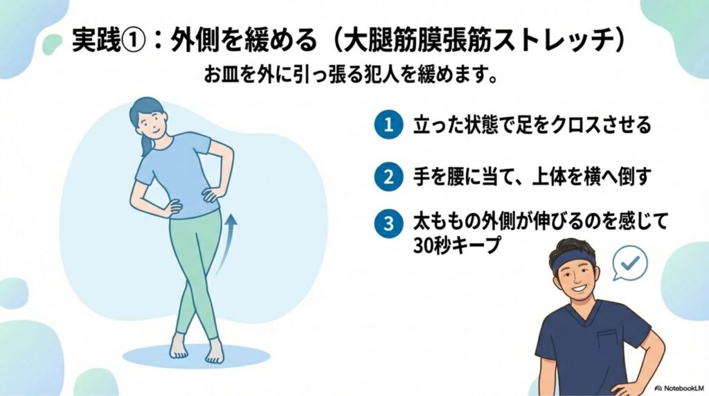 1. 外側を緩める(大腿筋膜張筋ストレッチ)