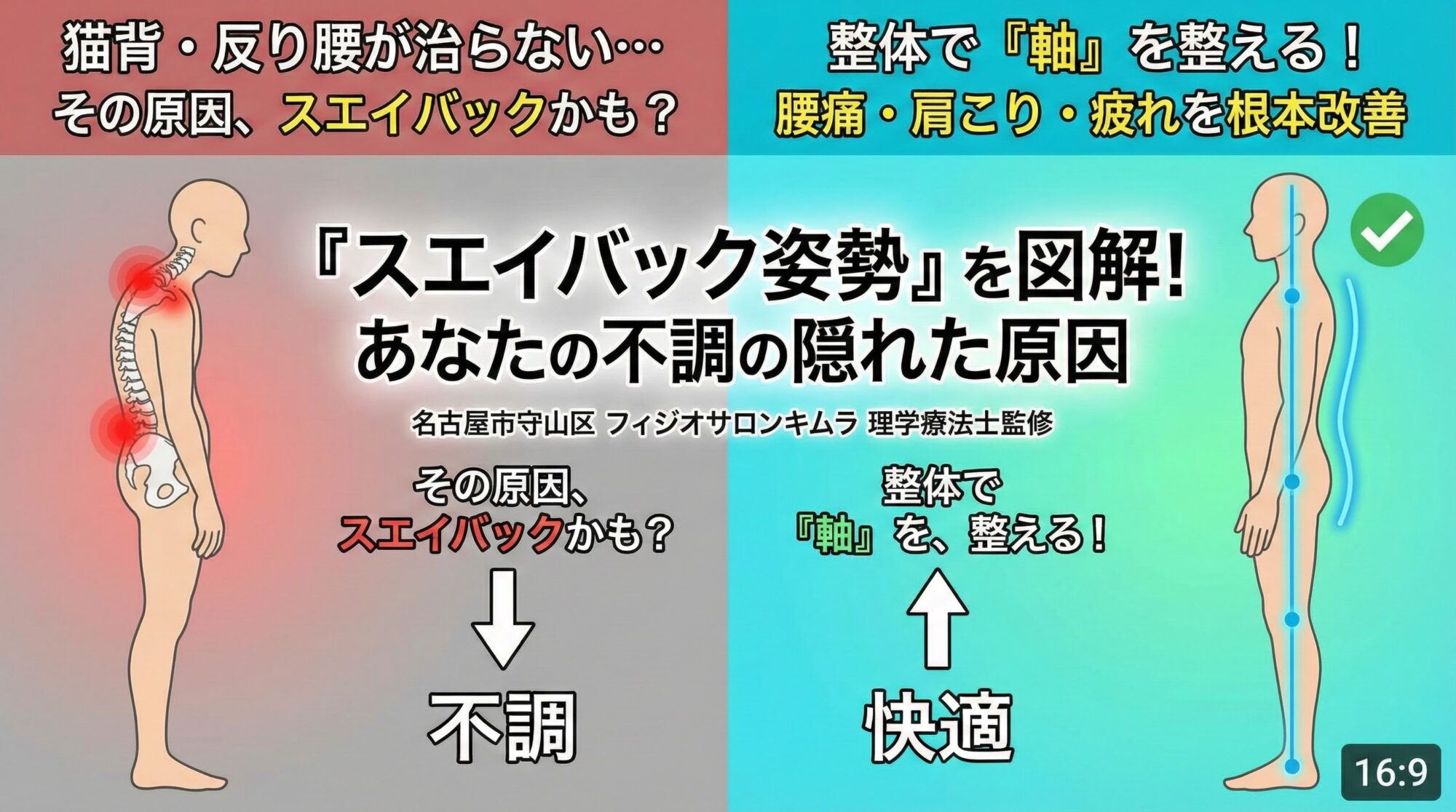 👉 名古屋市守山区のフィジオサロンキムラでは、スエイバックを含む「姿勢タイプ」を丁寧に評価し、整体とセルフケアで改善をサポートしています。