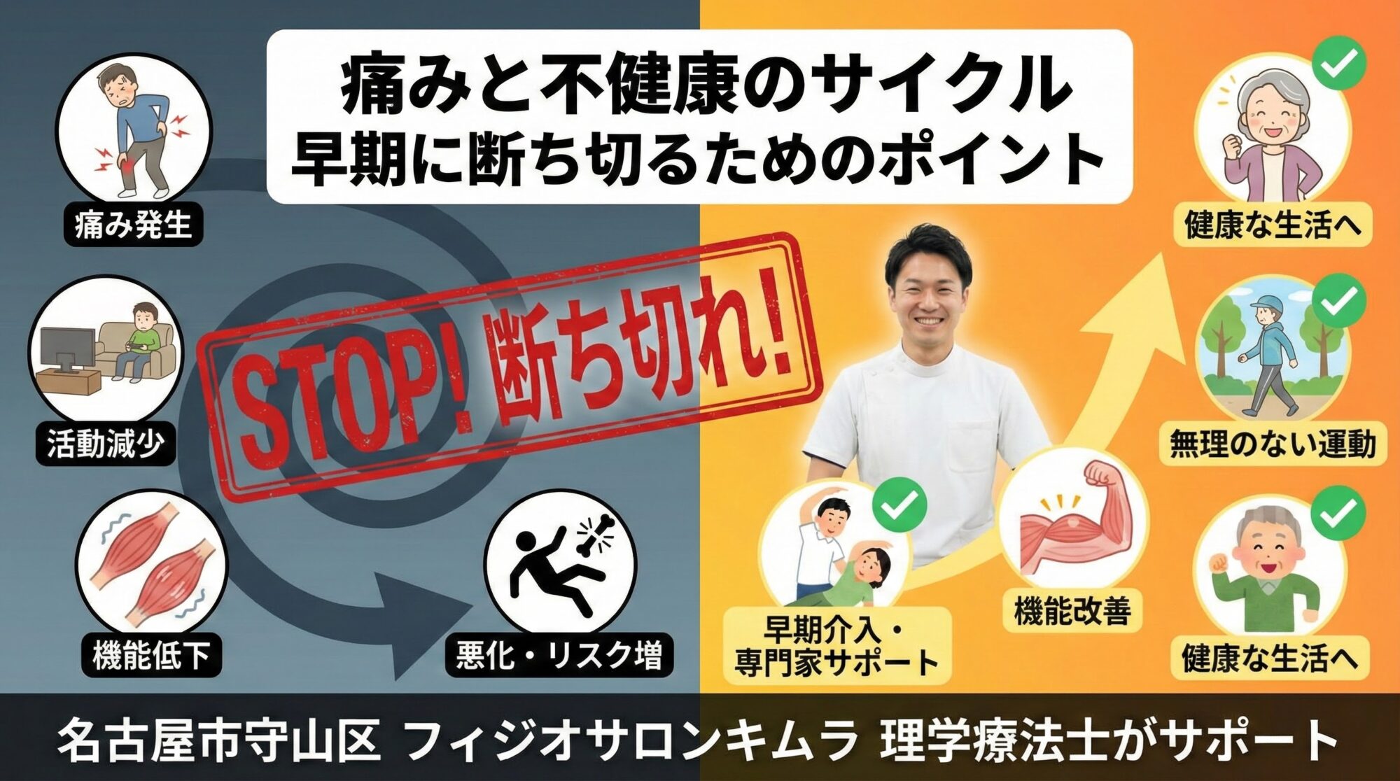 今回は、理学療法士の視点から、痛みを放置することで始まる「不健康のサイクル」の正体と、それを断ち切るための勇気ある一歩について解説します。