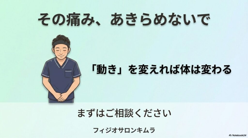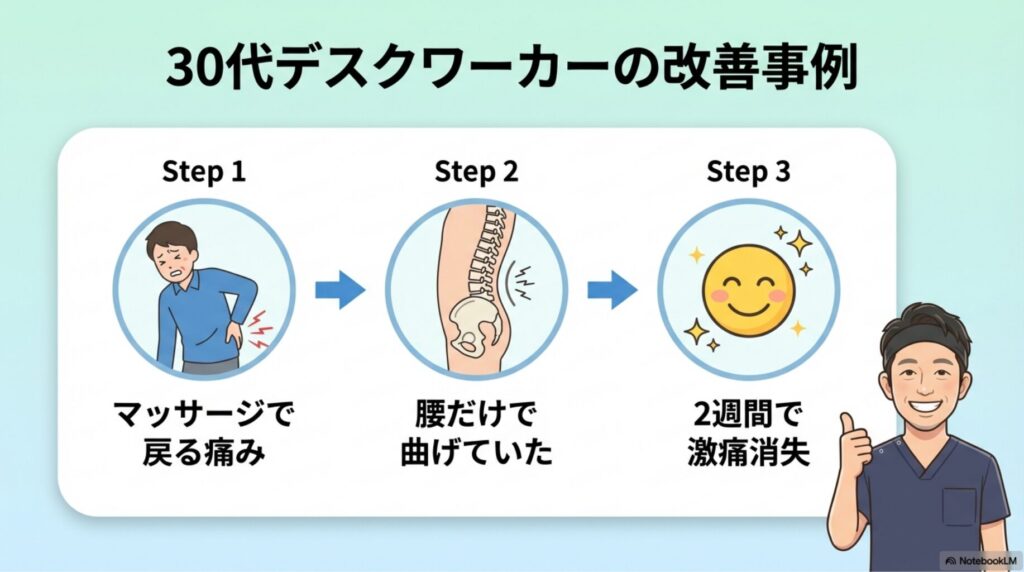 このように、「患部(腰)を揉む」のではなく「動きを変える」ことが解決の近道です。