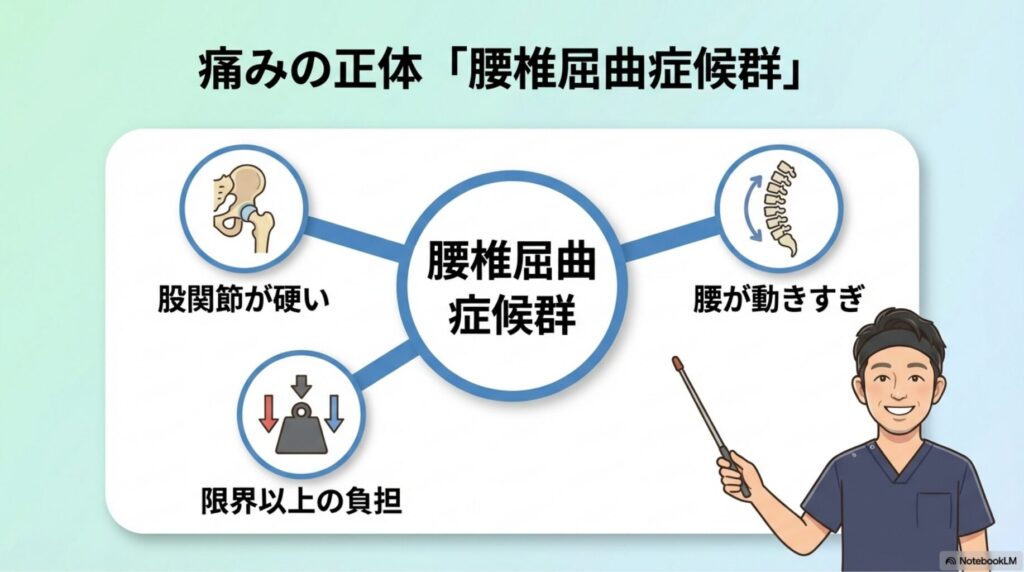 | 痛みのメカニズム | 股関節が動かず、腰椎だけが過剰に動いて(ハイパーモビリティ)負担が集中している |