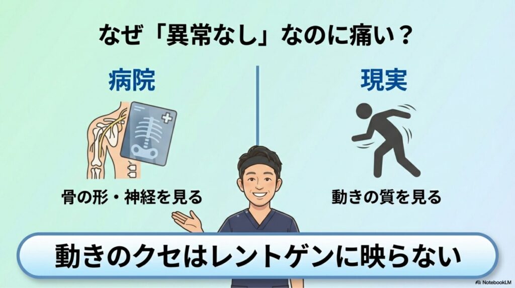病院の画像診断は「骨の形」や「神経の圧迫」を見るのが得意ですが、「動きの質」までは映し出せません。