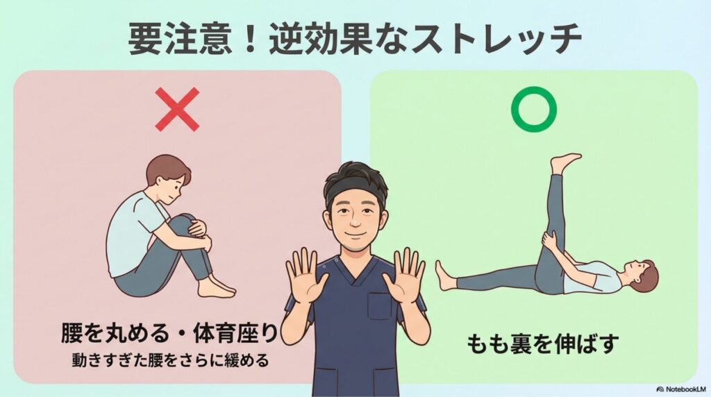 → すでに動きすぎて不安定になっている腰(ハイパーモビリティ)をさらに緩めてしまい、痛みを悪化させるリスクがあります。 - OK行動: お尻(股関節)を使う練習をする、太もも裏を伸ばす。