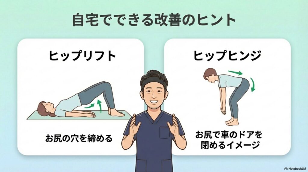 仰向けで膝を立て、お尻を持ち上げます。腰を反るのではなく「お尻の穴を締める」感覚で行うのがポイントです。 - 生活習慣での「ヒップヒンジ」