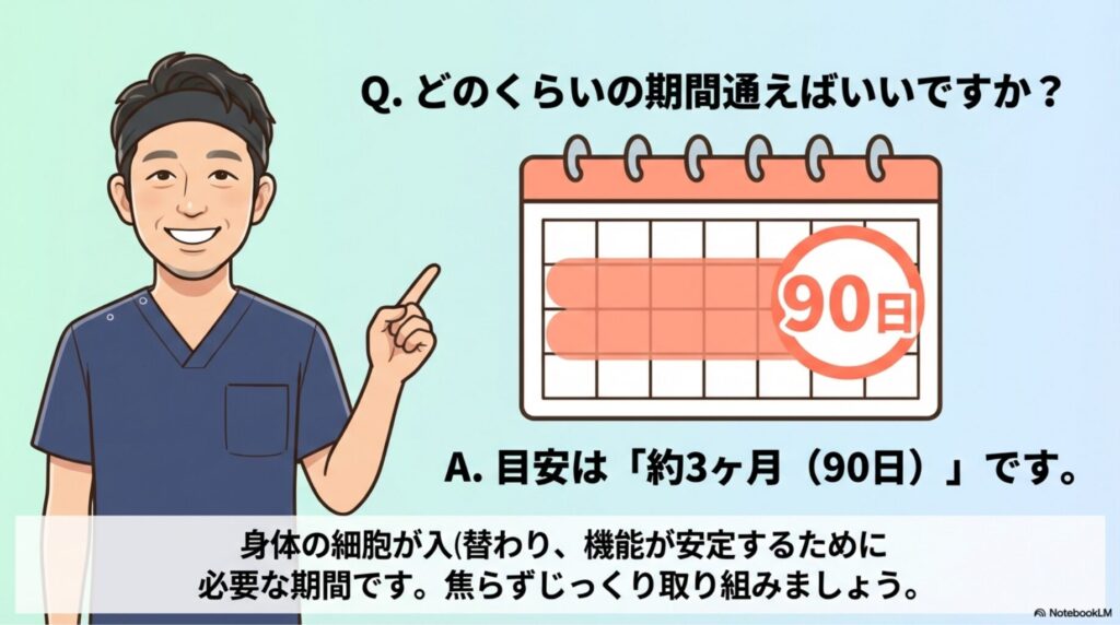 A. 症状や目標によりますが、身体の細胞が入れ替わり、機能が安定するには「約3ヶ月(90日)」が一つの目安となります。もちろん、数回で改善する場合もありますが、焦らずじっくり取り組む心構えが大切です。