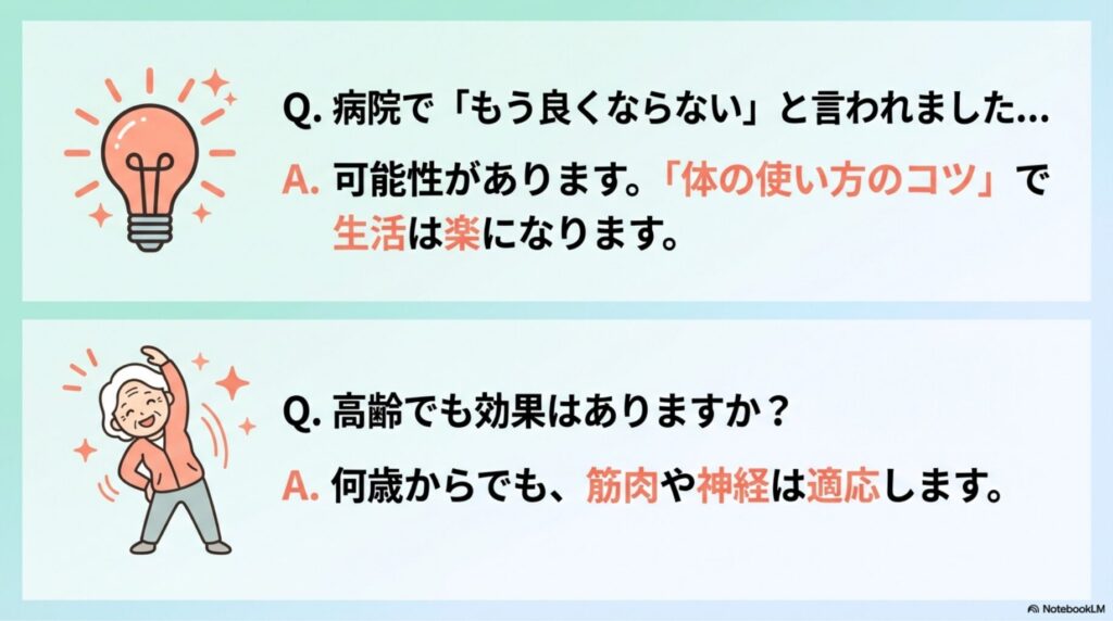 A. はい、可能性があります。病院での「良くならない」は「医学的な数値(可動域など)の限界」を指すことが多いですが、整体でのアプローチで「体の使い方のコツ」を掴むことにより、動作がスムーズになり、生活が楽になるケースは多々あります。