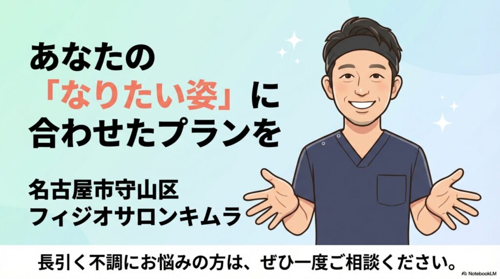 名古屋市守山区のフィジオサロンキムラでは、あなたの「なりたい姿」に合わせて、現実的で前向きなリハビリプランをご提案します。