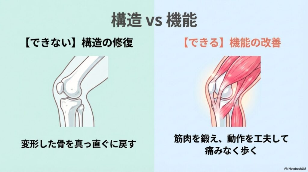 例えば、変形してしまった骨をリハビリだけで真っ直ぐに戻すことは不可能です(これは手術の領域です)。しかし、周りの筋肉を鍛え、動作を工夫することで「痛みなく歩けるようにする」ことはできます。