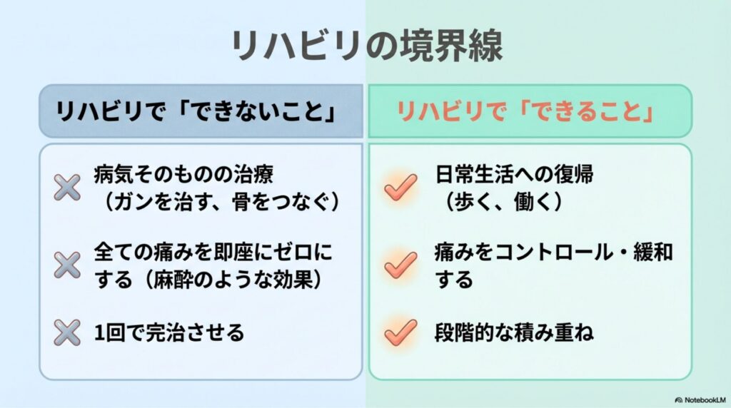 しかし、リハビリテーションは魔法ではありません。そこには明確な「できること」と「できないこと」が存在します。