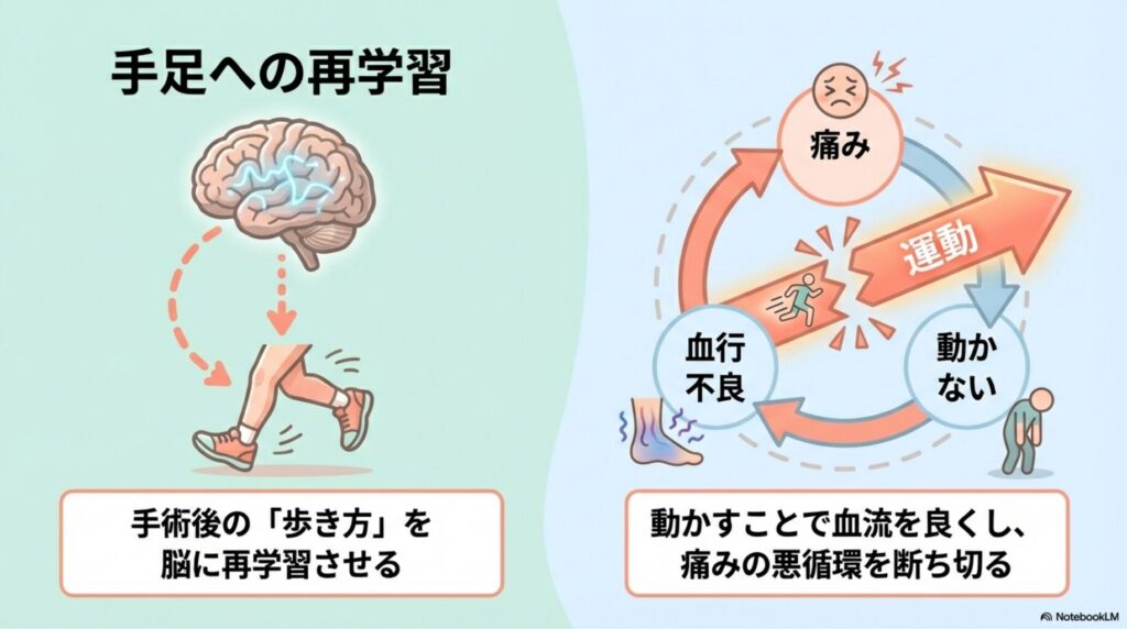 手術後の「歩き方」を忘れてしまった脳に対し、正しい動きを再学習させるのも重要な役割です。