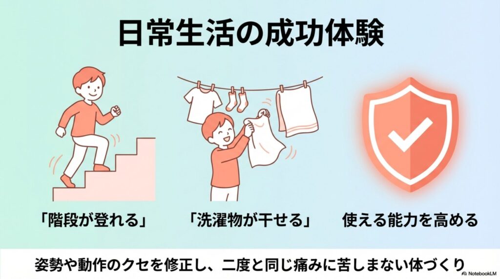「階段が登れるようになった」「洗濯物が干せるようになった」という、実際の生活で使える能力を高めます。