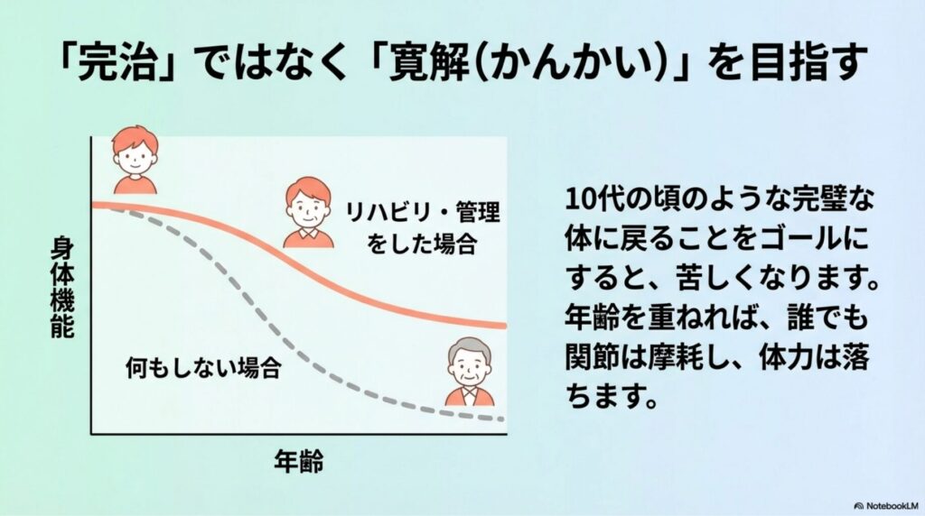 リハビリのゴールは、新品に戻ることではなく、「今の体の状態で、痛みとうまく付き合いながら、やりたいことを楽しめる状態(寛解)」を作ることです。