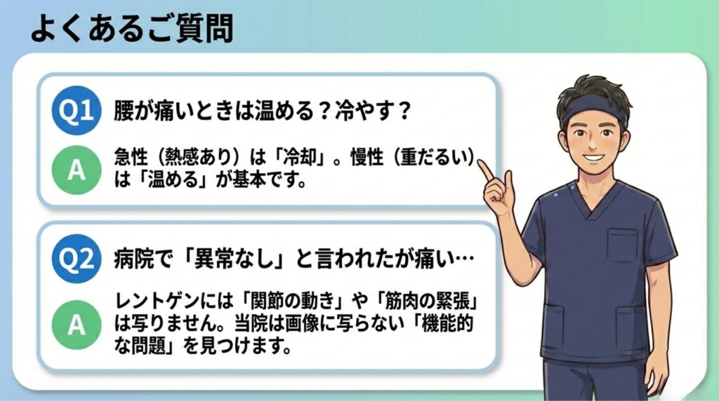 Q1. 腰が痛いときは温めるべきですか?冷やすべきですか?
