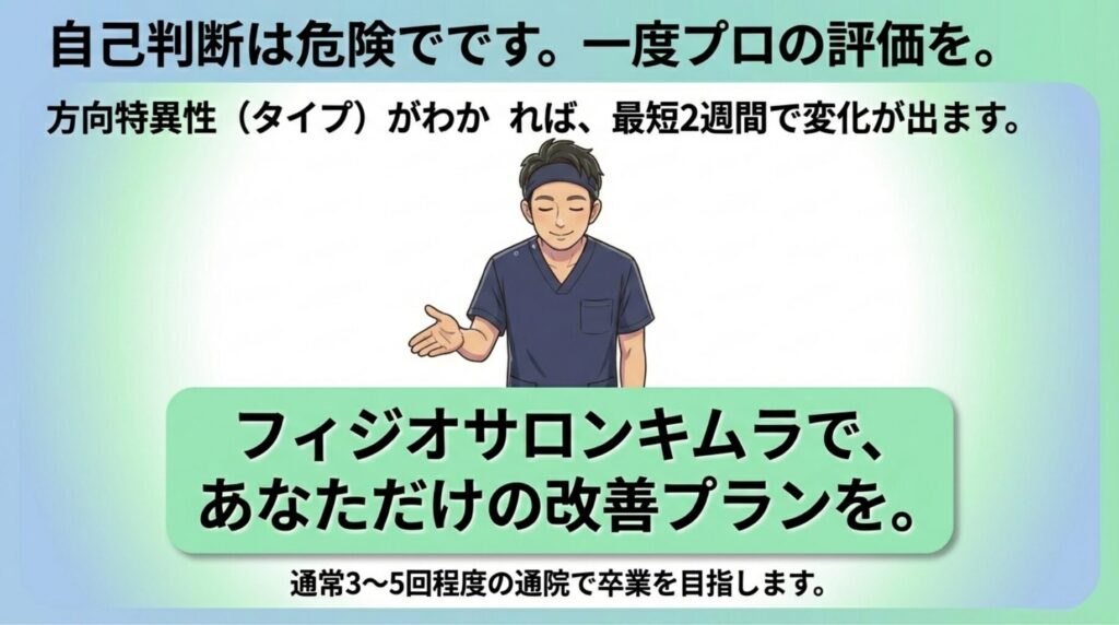 A. 症状の程度や期間によりますが、方向特異性(タイプ)が明確な場合、初回の施術とご自宅での運動指導で大きな変化を感じていただけるケースが多いです。通常、3〜5回程度の通院で卒業を目指すプランを提案しています。
