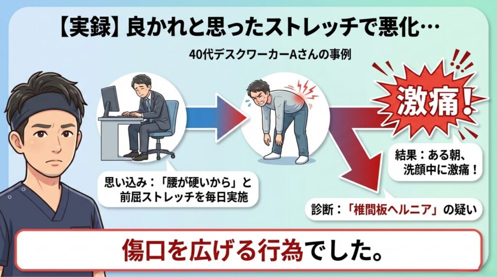 Aさんの腰痛は「屈曲型(前かがみが苦手)」でした。座り仕事で常に腰が丸まり、椎間板が後ろに飛び出しそうになっていた状態で、さらに「前屈ストレッチ」で追い打ちをかけてしまったのです。これは、傷口を広げる行為に他なりません。