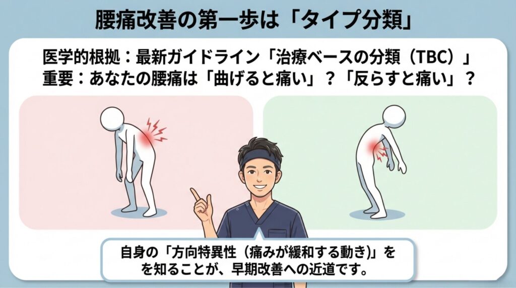 腰痛改善の鍵は、最新の理学療法ガイドラインである「治療ベースの分類(TBC)」に基づき、痛みの原因を「曲げると痛い(屈曲型)」か「反らすと痛い(伸展型)」に正しく分けることです。タイプを誤った自己流ストレッチは、椎間板や神経への負担を増大させ、症状を悪化させる最大の要因となります。まずは自身の方向特異性(痛みが緩和する動き)を把握し、医学的に正しい運動療法を行うことが早期改善への近道です。