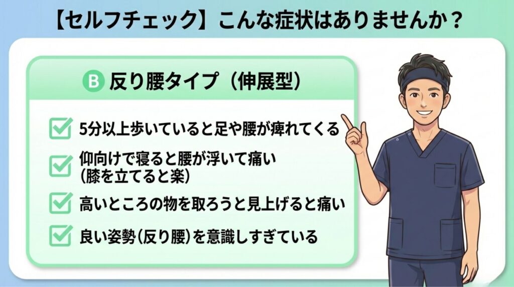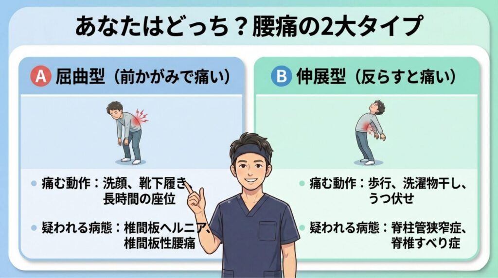 | 特徴・症状 | 🅰️ 屈曲型(前かがみで痛い) | 🅱️ 伸展型(反らすと痛い) |