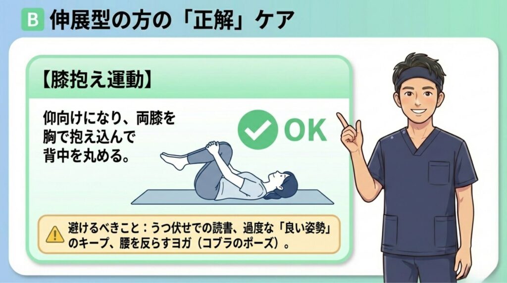 - 避けるべきこと:うつ伏せでの読書、過度な「良い姿勢」のキープ、腰を反らすヨガ。