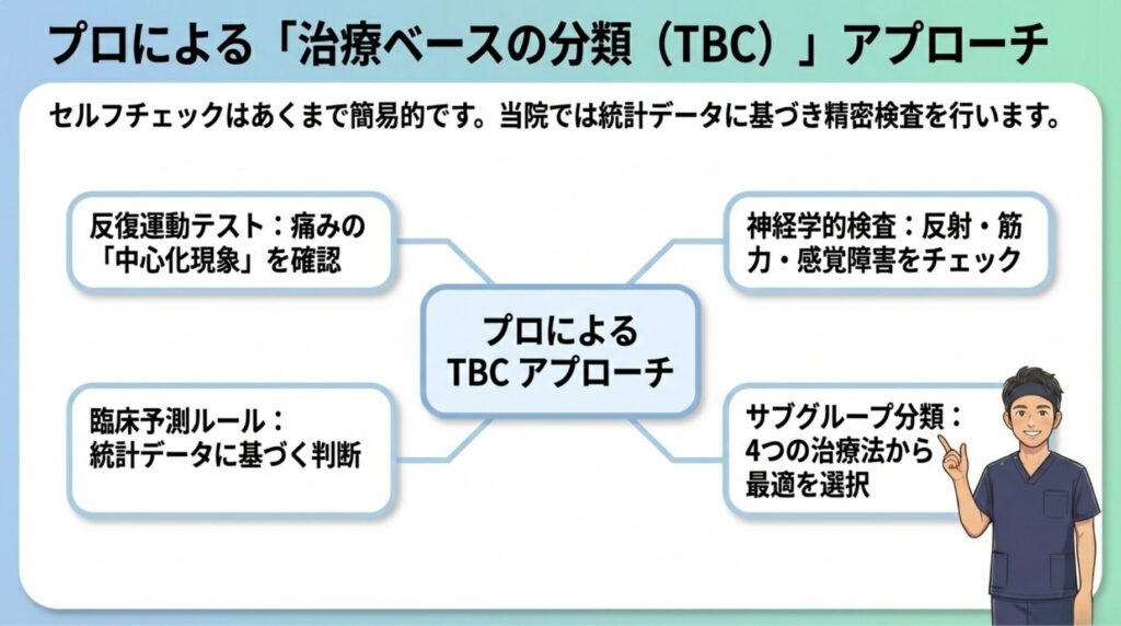 セルフチェックはあくまで簡易的なものです。フィジオサロンキムラでは、「臨床予測ルール(Clinical Prediction Rules)」という統計データに基づき、より精密な検査を行います。