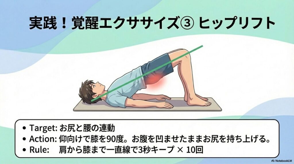 - 10回繰り返します。腰を反りすぎず「お尻」で持ち上げる意識がポイントです。