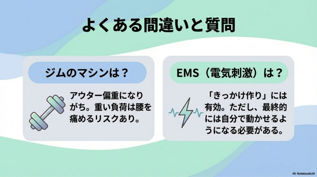A. EMSは、自分で動かしにくい深層筋に刺激を入れる「きっかけ作り」としては非常に有効です。ただし、最終的な目標は「日常生活の中で無意識にインナーマッスルが使えること」ですので、EMSだけに頼らず、並行して能動的な運動(自分で動かすこと)を行うのがベストです。