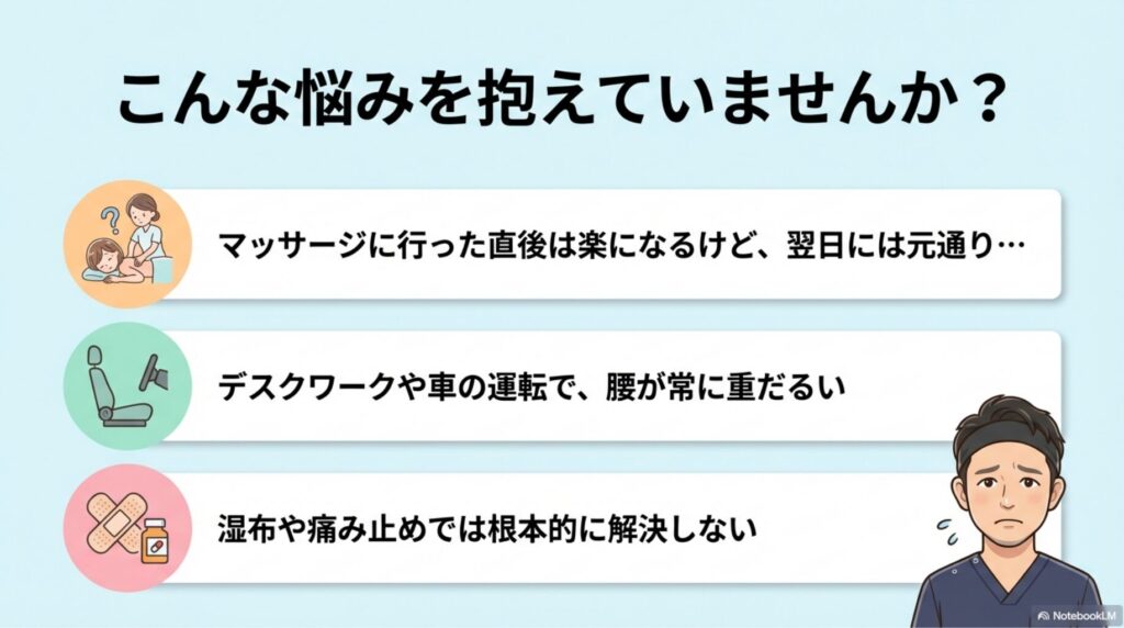 「マッサージに行った直後は楽になるけど、翌日には元通り…」