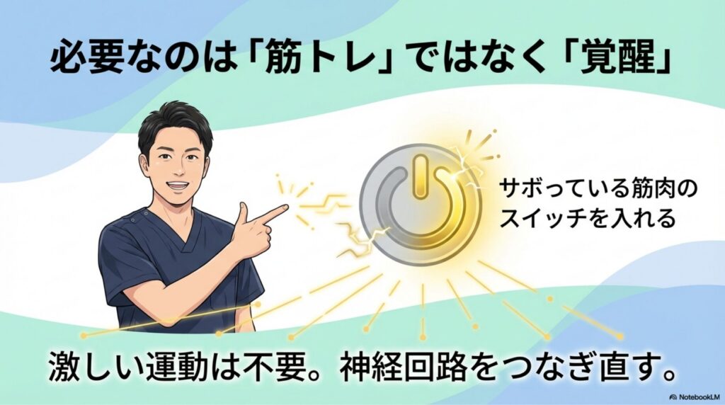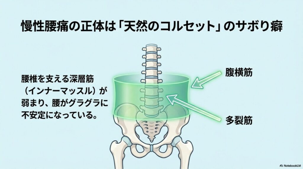 しかし、運動不足や姿勢不良でこれらの筋肉が「サボる(機能低下)」と、表面の筋肉だけで腰を支えようとして過度な負担がかかり、慢性的な痛みが発生します。つまり、サボっているインナーマッスルを叩き起こさない限り、腰痛は何度でも再発します。