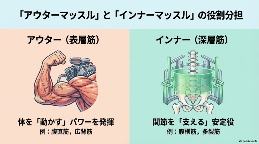 腰痛を治すためには、筋肉の「役割分担」を知ることが大切です。表層の筋肉(アウター)と深層の筋肉(インナー)の違いを表にまとめました。