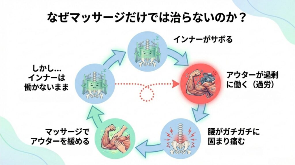 多くの腰痛患者さんは、「インナーがサボっているせいで、アウターが過労死寸前になっている」状態です。アウターをマッサージで緩めても、インナーが働かない限り、すぐにまたアウターが硬くなってしまいます。