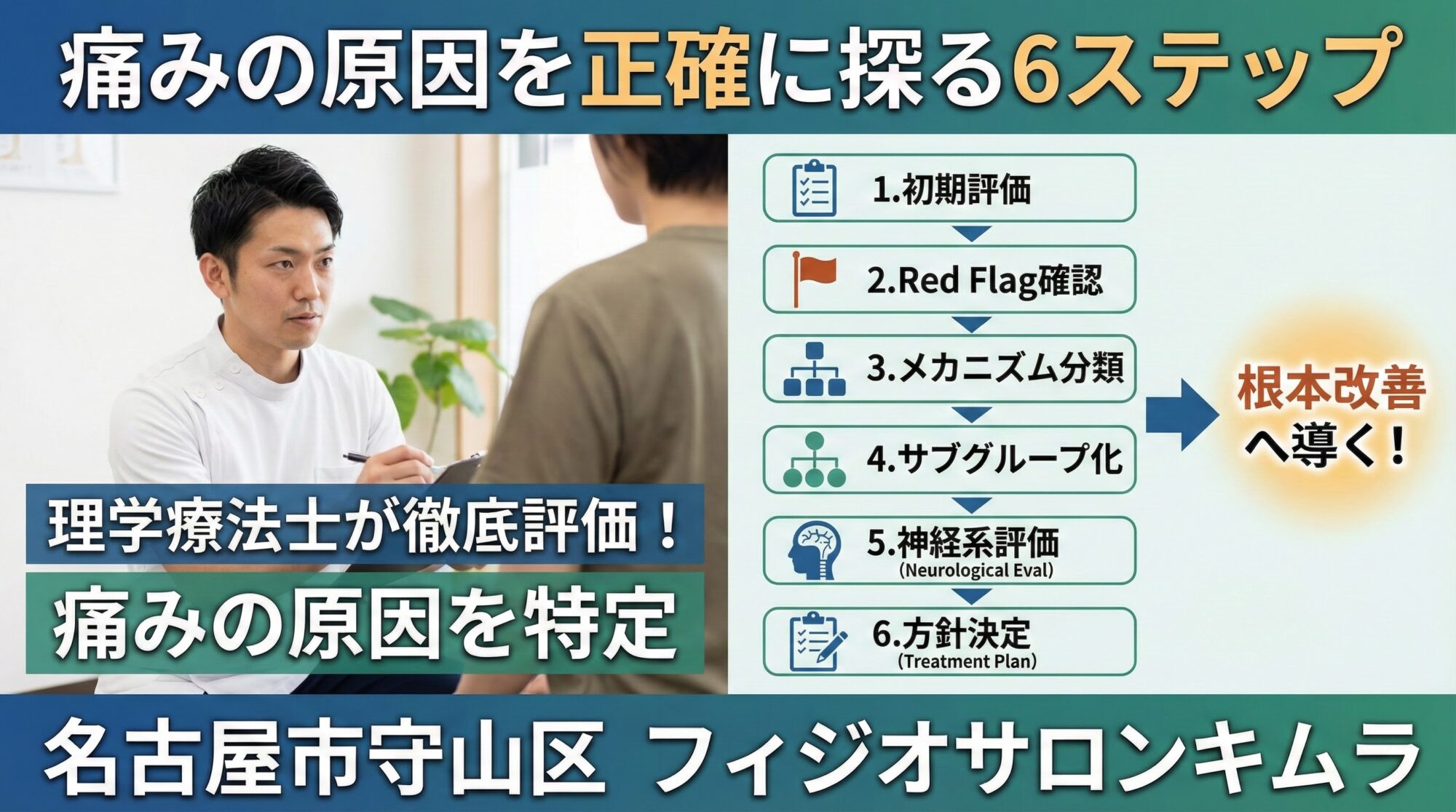 名古屋市守山区のフィジオサロンキムラでは、感覚や経験則だけに頼らず、医学的根拠に基づいた「6つのステップ」であなたの痛みの正体を解明します。