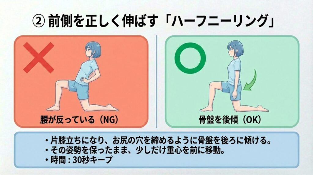 ② 前側を正しく伸ばす「ハーフニーリング・ストレッチ」