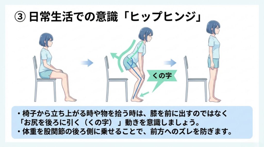 椅子から立ち上がる時や、物を拾う時、膝を前に出すのではなく「お尻を後ろに引く(くの字に折る)」動きを意識しましょう。
