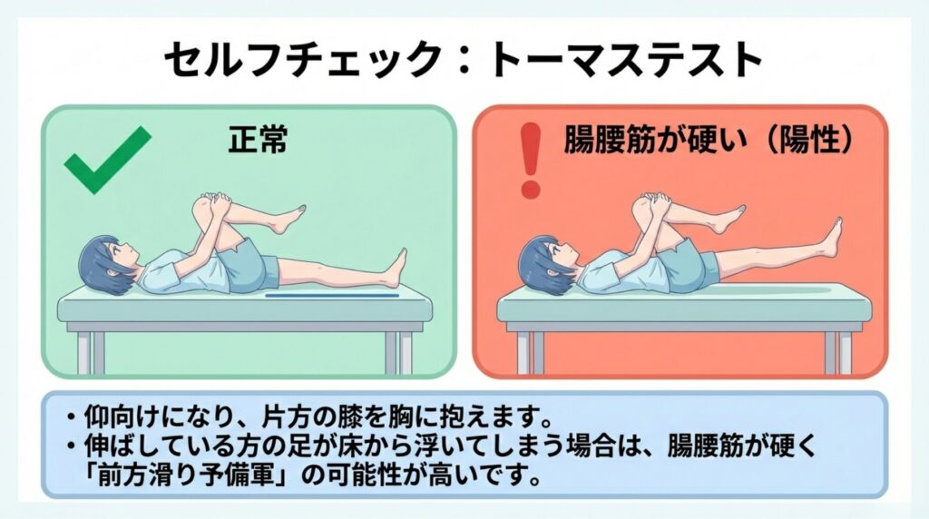 A. 簡易的なチェックとして「トーマステスト」があります。仰向けになり、片方の膝を胸に抱えます。この時、伸ばしている方の足が床から浮いてしまったり、外側に逃げようとしたりする場合は、腸腰筋が硬く、前方滑り予備軍の可能性が高いです。