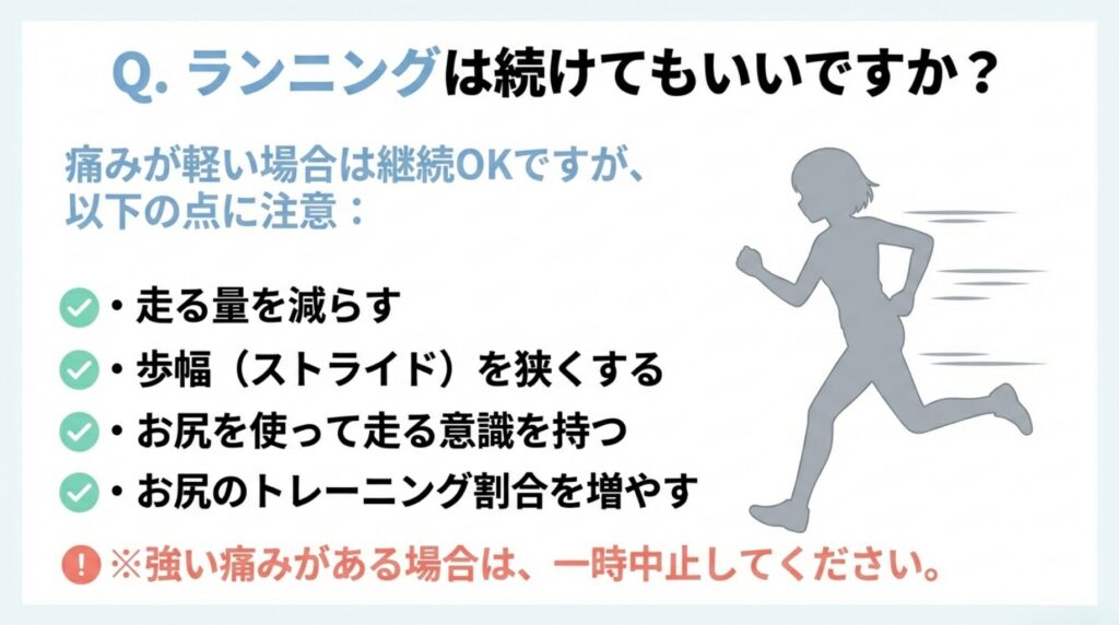 A. 強い痛みや、翌日に痛みが残る場合は、炎症が起きている可能性があるため一時中止をおすすめします。痛みが軽い場合は、「歩幅を狭くする」「お尻を使って歩く」ことを意識して継続しても大丈夫ですが、走る量はいったん減らし、お尻のトレーニング(クラムシェルなど)の割合を増やしてください。