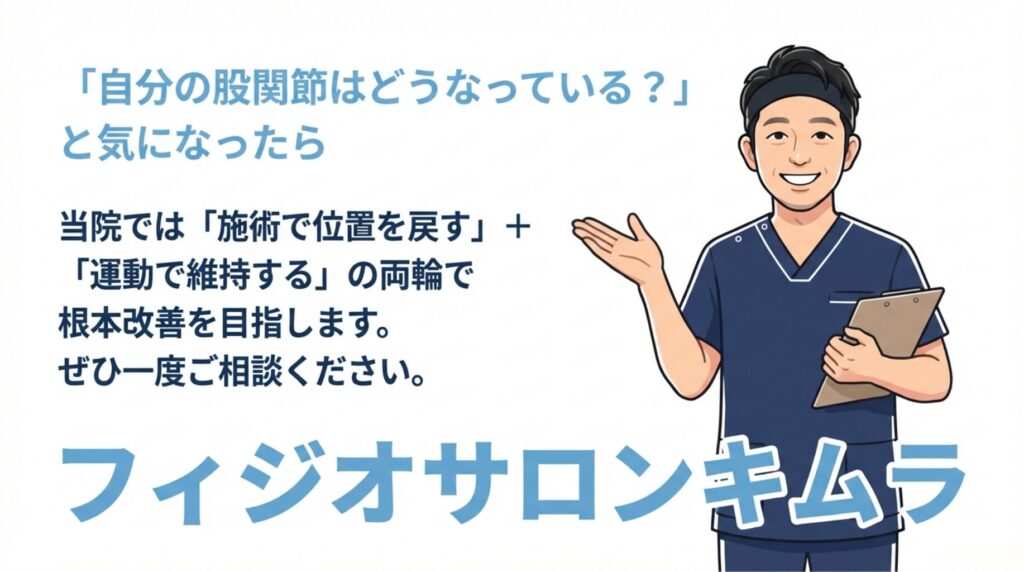 A. 整体(徒手療法)で一時的に骨頭の位置を正しい位置に戻すことは可能です。しかし、それを維持するための「筋力(お尻の支え)」がないと、歩いているうちにまたズレてしまいます。当院では「施術で位置を戻す」+「運動で維持する」の両輪で根本改善を目指します。