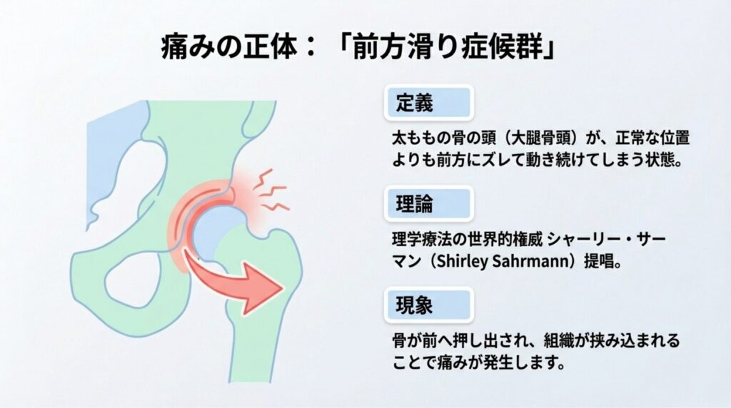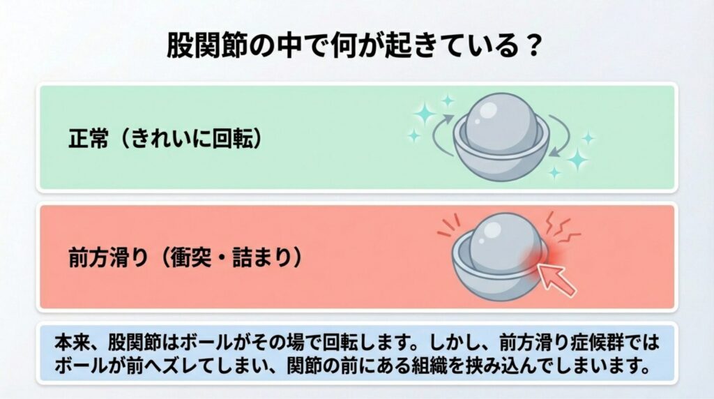 股関節前方滑り症候群(Femoral Anterior Glide Syndrome)とは、太ももの骨の頭(大腿骨頭)が、正常な位置よりも前方にズレて動き続けてしまう状態のことです。