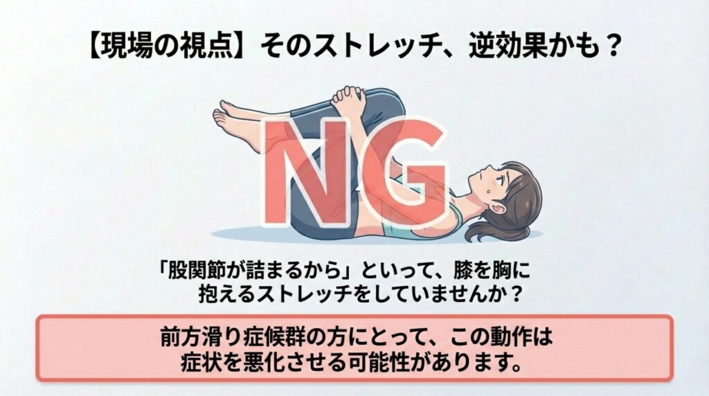 実は、前方滑り症候群の方にとって、この動作はさらに症状を悪化させる可能性があります。