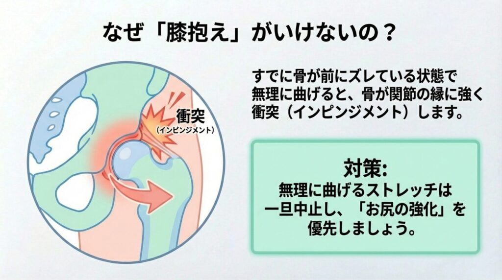 なぜなら、すでに骨頭が前にズレている状態で無理に股関節を深く曲げると、ズレた骨が関節の縁にさらに強く衝突(インピンジメント)してしまうからです。