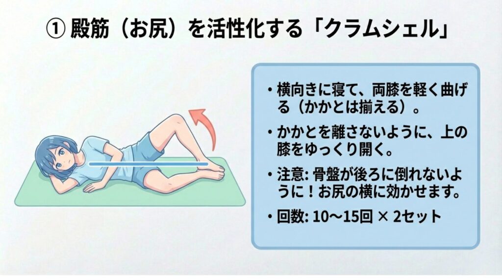 ① 殿筋(お尻)を活性化する「クラムシェル」