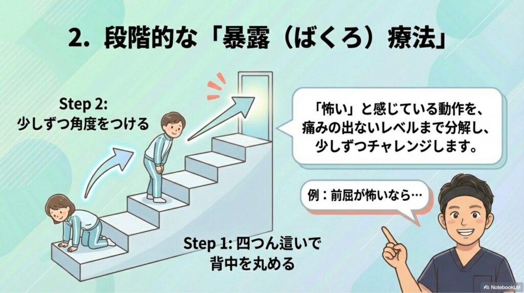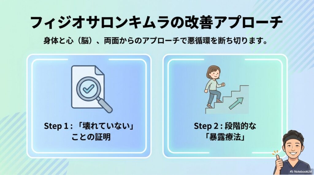 まずは丁寧な評価を行い、「骨や神経は壊れていない」という事実を共有します。これにより、「動いても大丈夫なんだ」という安心感(認知の修正)を作ります。