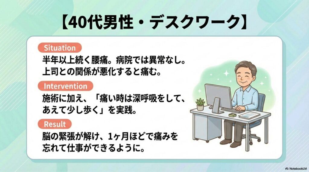 施術で身体を緩めるのと並行して、「痛い時は深呼吸をして、あえて少し歩く」という対処法を実践していただいたところ、脳の緊張が解け、1ヶ月ほどで痛みを忘れて仕事ができるようになりました。