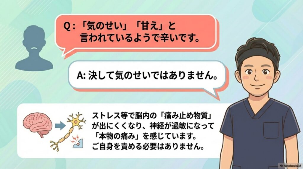 A. 決して気のせいではありません。ストレスや不安があるとき、脳内では痛みを抑制する物質が出にくくなり、実際に神経が過敏になって「本物の痛み」を感じています。痛いのは事実ですので、ご自身を責める必要はありません。