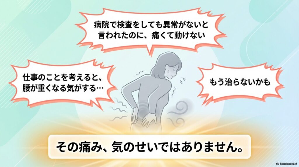 - 腰痛がなかなか良くならず、「もう治らないかも」と不安を感じている方