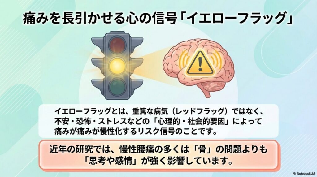 イエローフラッグ(Yellow Flags)とは、重篤な病気(レッドフラッグ)ではないものの、不安・恐怖・ストレス・誤った思い込みなどの「心理的・社会的要因」によって、痛みが慢性化・難治化してしまうリスク信号のことです。
