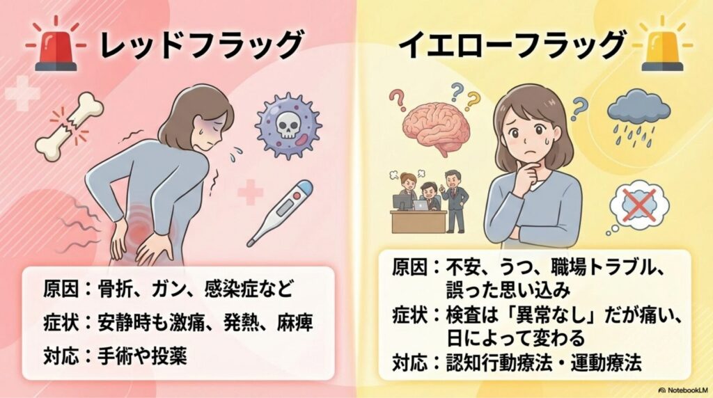- 「イエローフラッグ」という、腰痛の見逃せない危険信号を理解できる